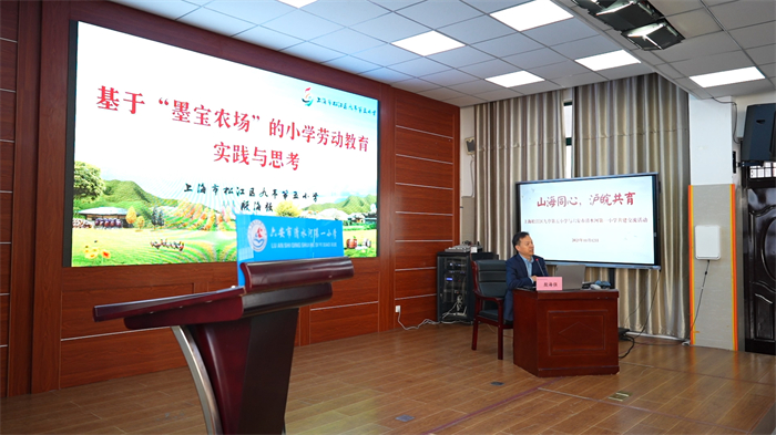 在基于“墨宝农场”的小学劳动教育实践与思考专题报告中,九亭第五小学校长殷海强以“墨宝农场”实践体系为核心,分享学校“五彩童年,活力校园”办学理念下的劳动教育经验,明确“身心健康、乐学善思、特色见长”的学生成长目标,详细介绍了开设的英语农场记者课、数学丈量面授课、语文农场习作课等跨学科课程,以及结合“双减”政策设计美食日记、水果儿歌创编等特色任务,为清水河第一小学劳动教育提质增效提供了可借鉴的实践范本。