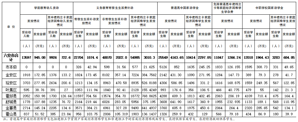 【资助进展情况通报】六安市各级各类学校家庭经济困难学生资助进展情况10月份通报(救助人数及资金使用通报)