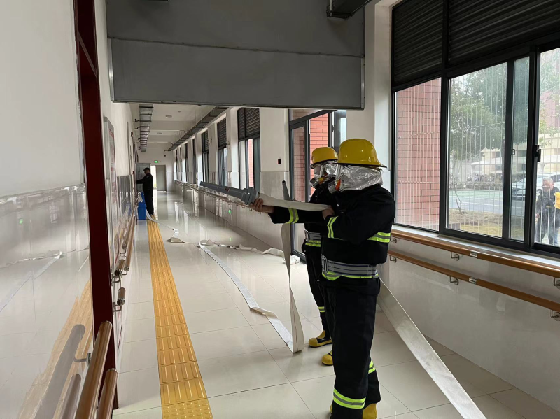 下午16时,随着火灾警报响起,演练开始,消防控制室人员启动消防应急疏散广播,通知人员有序疏散撤离。在值班教师、宿舍管理员及楼层安全员的指引下,各住校师生弯着腰、猫着步,用潮湿的毛巾捂住口鼻,按照指定路线快速、有序撤离到安全地带。此次演练仅用时1分35秒就来到食堂南侧广场。与此同时,消防控制室人员调集人员进行灭火,并拨打“119”火灾报警电话。