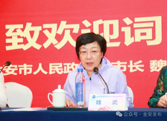 魏武在致辞中对省泳协年会的召开表示祝贺,她指出,安徽省游泳运动协会年会在六安举办,是对六安游泳事业发展的支持和信任,希望省泳协继续发挥协会专业优势和平台作用,帮助推动我市游泳事业纵深发展,也希望省体育局能够一如既往地关注和支持六安全民健身事业的发展,帮助我市打造更多的品牌赛事,拉动更多优质体育资源向六安积聚,推动我市体育事业蓬勃发展。