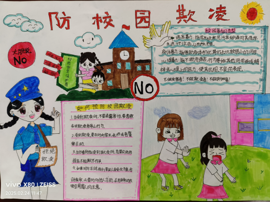 各班同学还绘制了防欺凌手抄报,成为校园正能量的传播者,共同守护这片纯净的天空。