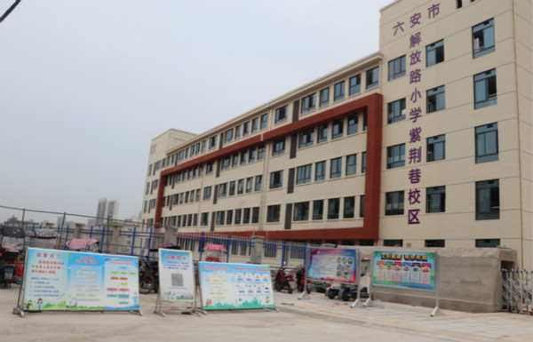 六安市解放路小学紫荆巷校区是六安市解放路小学的又一所分校。学校坐落于六安市中心城区,位于绿水长流的淠河之滨,紧邻风景秀丽的滨河公园。学校规划用地32010m²(约48亩),总建筑面积28368m²。学校领导班子由六安市解放路小学本部经验丰富的管理人员组成。目前,紫荆巷校区共有13个班、500名学生。