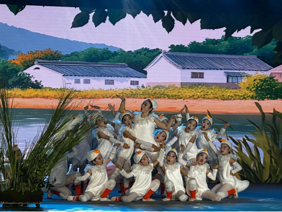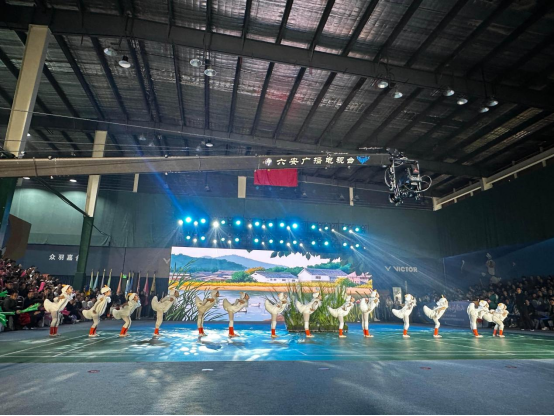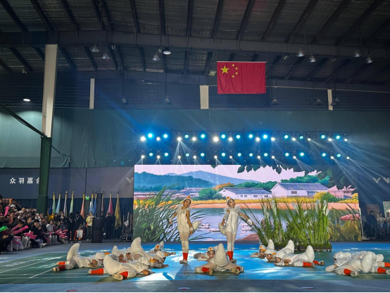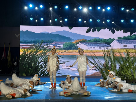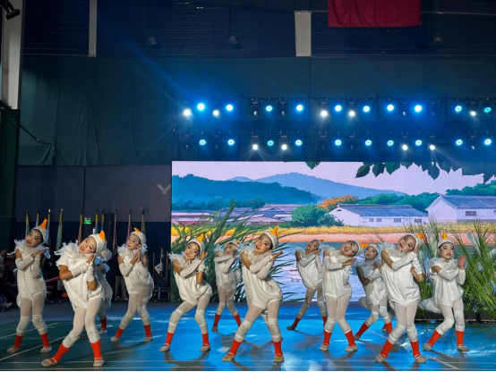 舞台上,小演员们身着洁白的 “鹅” 造型服装,头戴可爱的小帽子,橙红色的 “脚掌” 格外亮眼。他们以灵动的舞姿,模仿着小鹅的各种形态,时而俏皮地摆动身体,时而舒展身姿展现优雅。伴随着轻快的音乐,孩子们或是两两携手,或是伏地低吟,将一群憨态可掬的小鹅形象演绎得淋漓尽致。 舞台背景的大屏上,展现着山水田园的美丽风光,与孩子们的表演相得益彰,仿佛将观众带入了一个充满诗意的 “鹅” 的世界。孩子们认真专注的神情、活泼可爱的表演,赢得了现场观众的阵阵掌声和欢呼声,也为此次羽毛球赛事启动仪式增添了一抹温暖而绚丽的色彩。