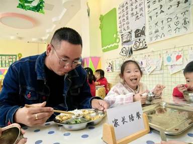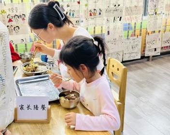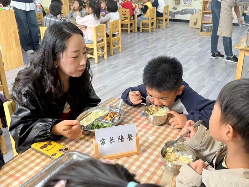 午餐铃声响起,家长们端起与幼儿同款的餐盘,坐进温馨的小餐桌旁,开启陪餐体验。“红烧排骨炖得软烂入味,正适合小班孩子的咀嚼能力;清炒时蔬色泽鲜亮,清爽不腻。”一位陪餐的张妈妈轻声评价,同时认真填写《家长陪餐反馈表》。更有家长主动靠近孩子,温柔鼓励挑食的小朋友尝试新食物,在轻松氛围中传递健康饮食理念。