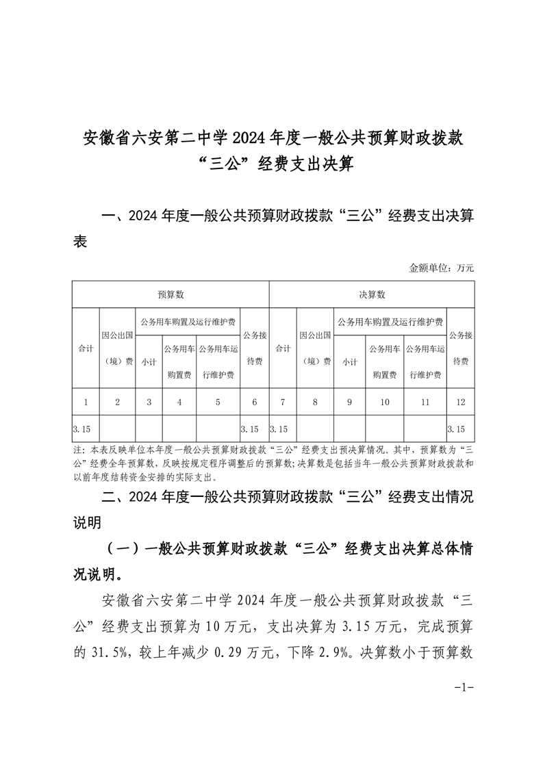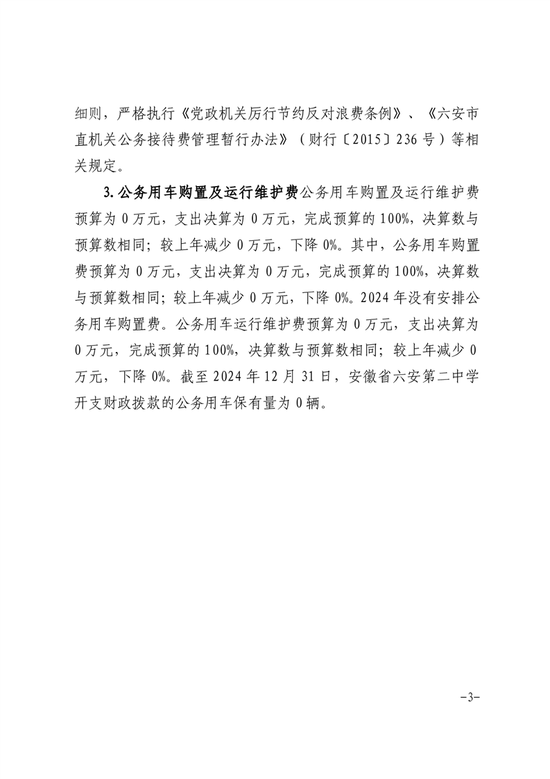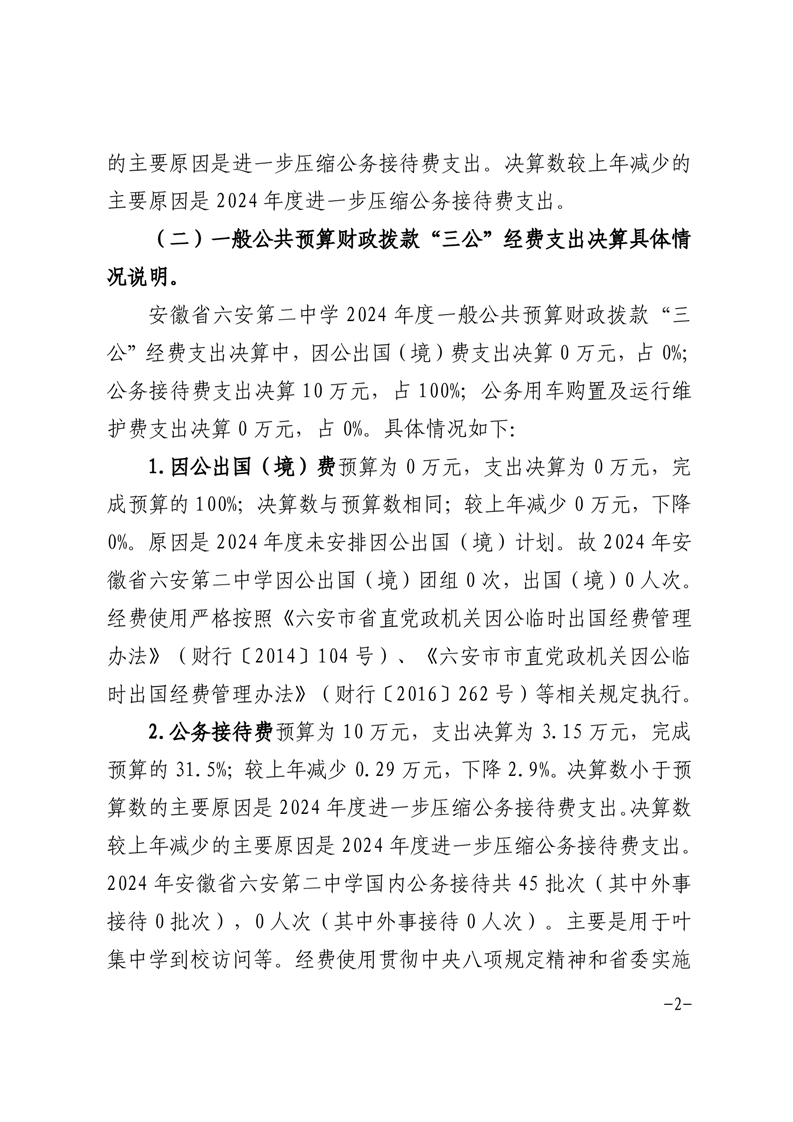 安徽省六安第二中学2024年度一般公共预算财政拨款“三公”经费支出决算报表及说明公开