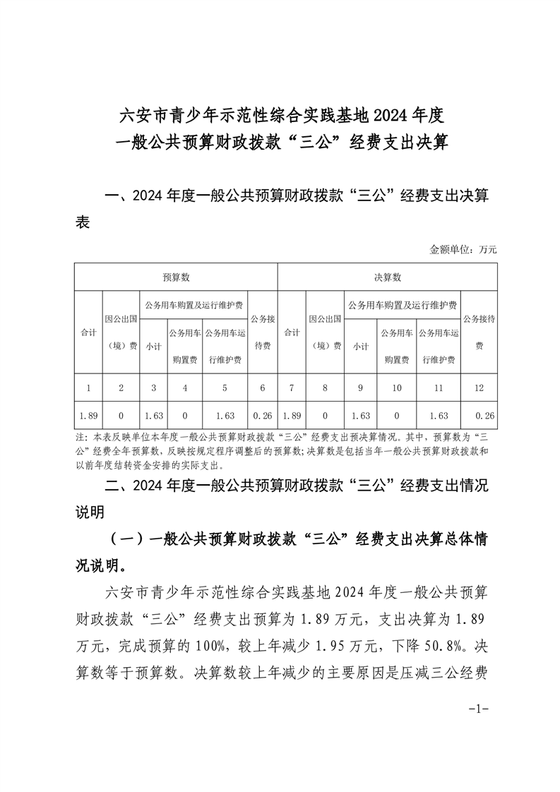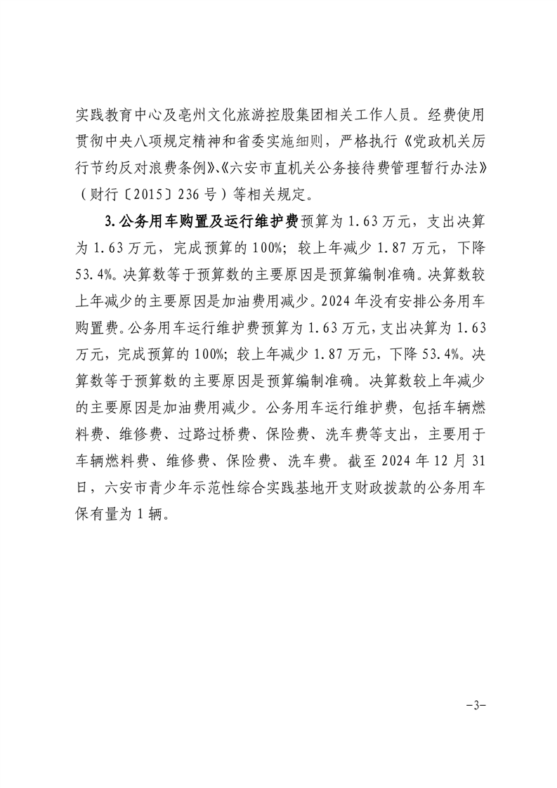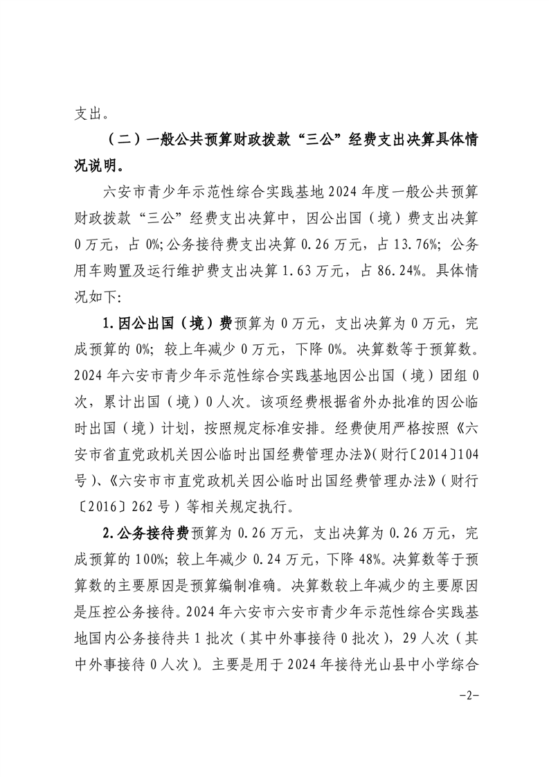 六安市青少年示范性综合实践基地2024年度一般公共预算财政拨款“三公”经费支出决算报表及说明公开