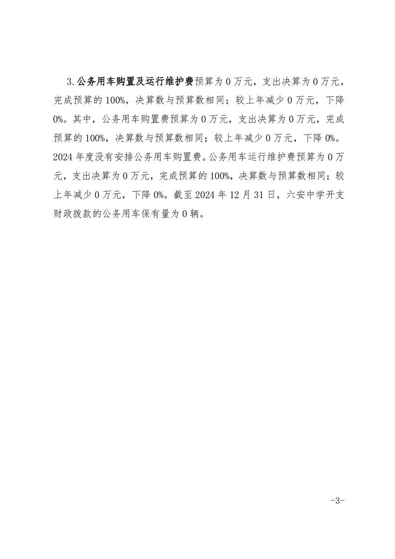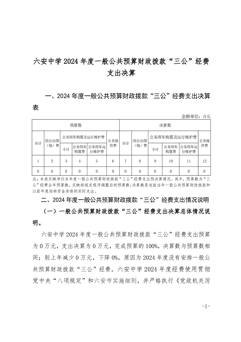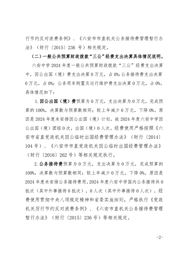 六安中学2024年度一般公共预算财政拨款“三公”经费支出决算报表及说明公开