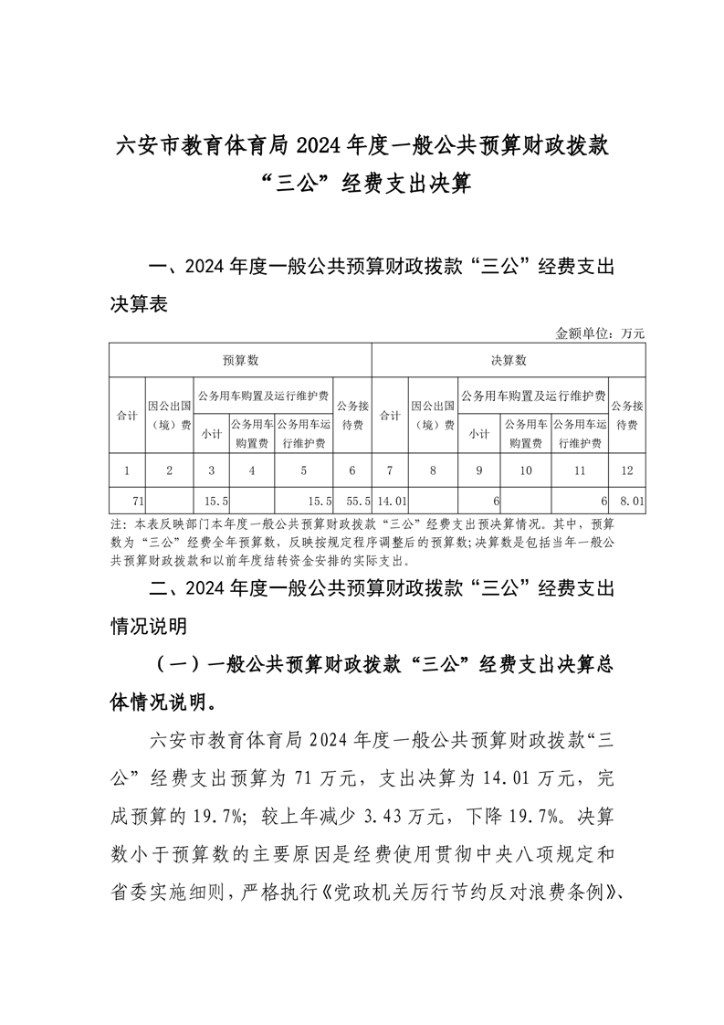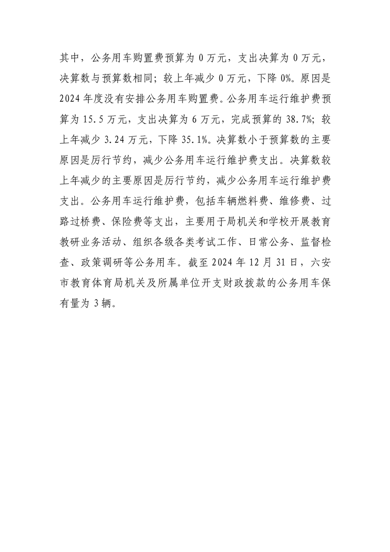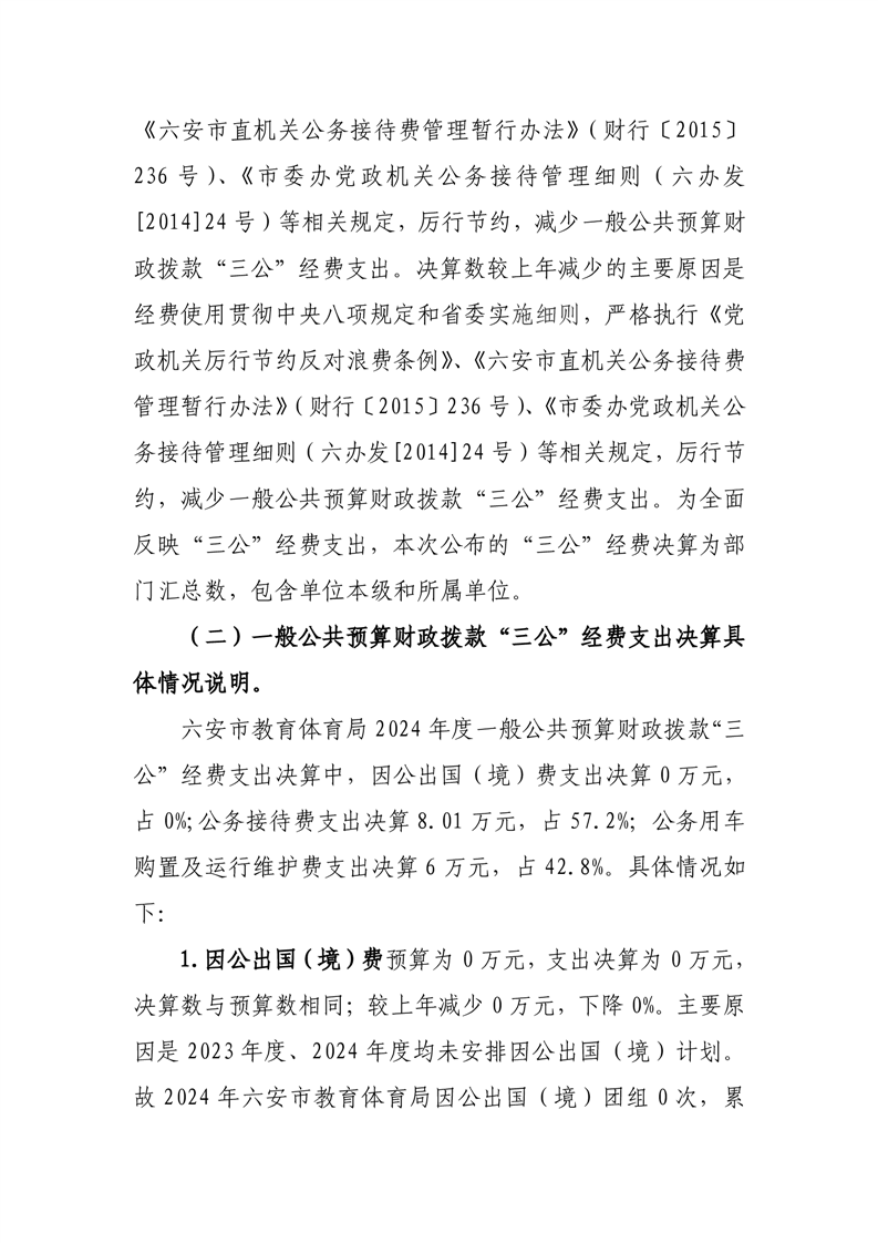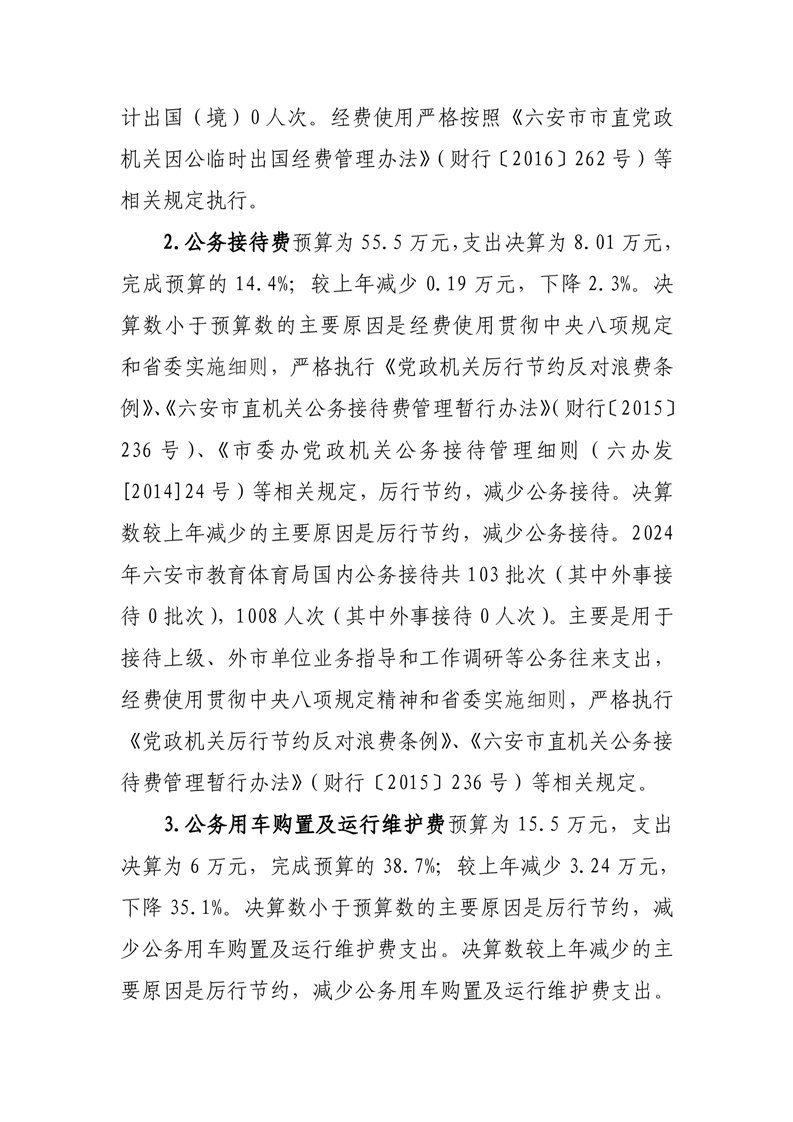 六安市教育体育局 2024 年度一般公共预算财政拨款“三公”经费支出决算报表及说明公开