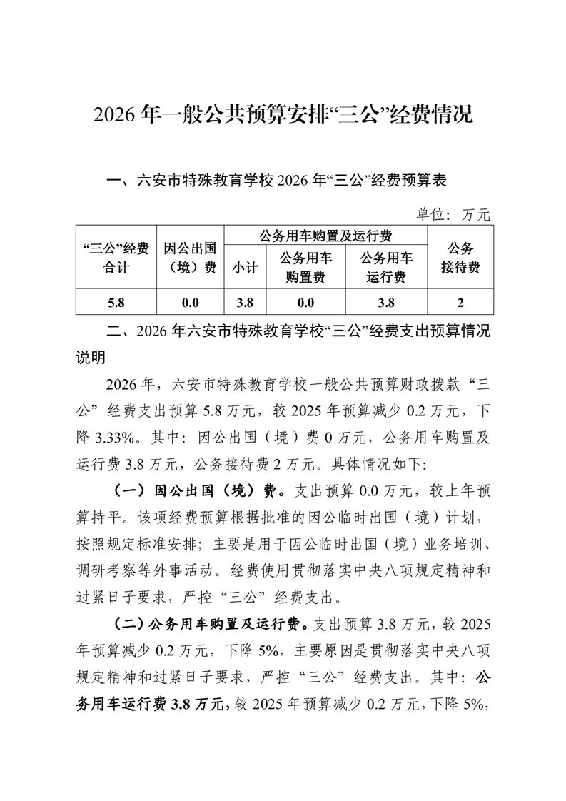 六安市特殊教育学校2026年单位一般公共预算安排“三公”经费情况公开