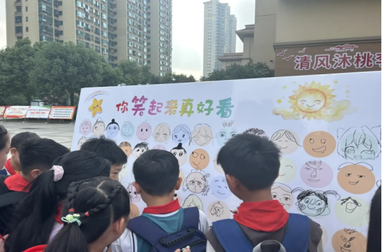 开展户外活动。本次户外活动分“心理绘画成果展”“你笑起来真好看”“心语心愿”三个板块,活动对象覆盖全校师生。师生们在微笑打卡墙上画下自己最美的微笑。六年级同学还将自己的心愿、寄语写在便签纸上,粘贴在心愿墙上,也把美好和希望留在心间。