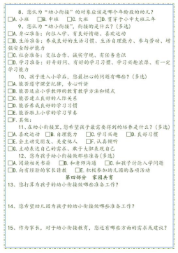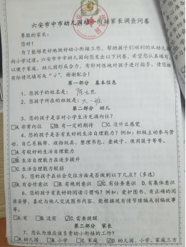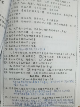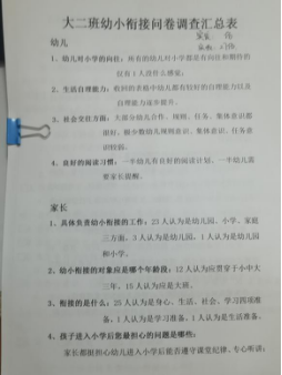 为精准了解家长们针对孩子幼升小的实际困惑,幼儿园对全园家长发放了幼小衔接问卷调查表。通过问卷调查的方式,了解家长对幼小衔接概念的知悉程度、关于幼儿入小学的顾虑和疑问,收集家长们对幼小衔接的认识、具体做法、存在的困惑和问题。