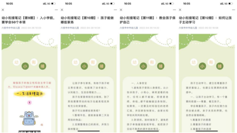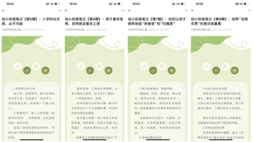经过调查和研究,幼儿园形成了幼儿园、家庭教育实操体系,创设了幼小衔接家庭育儿“微笔记”,引导家长从细节把握幼儿的心理,发掘幼升小过程中易忽略却又极其重要的“小”事情,有针对性的开展家庭幼小衔接工作。