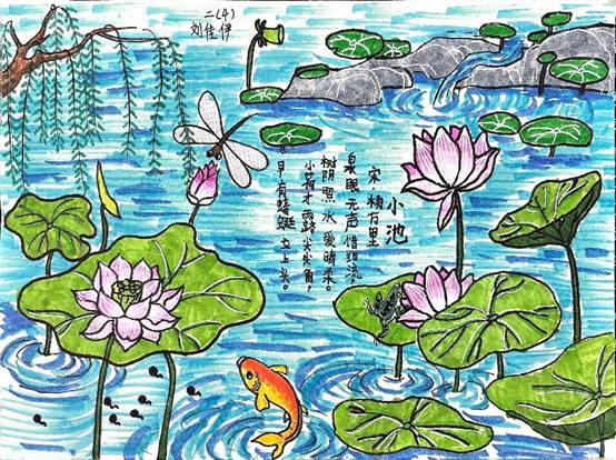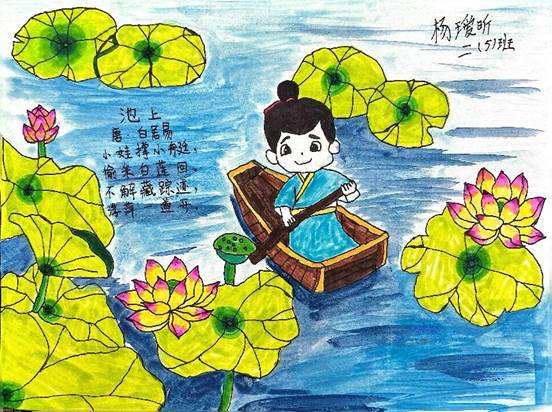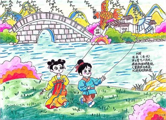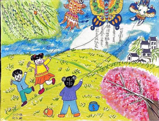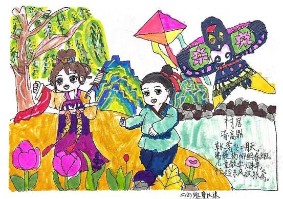 活动中,同学们从《小池》《望庐山瀑布》《村居》等经典古诗中选取自己喜爱的作品,用彩笔勾勒出心中的诗意画面。孩子们有的用笔勾勒出“树阴照水爱晴柔”的初夏美好景象,有的则以水墨画的风格呈现出“疑是银河落九天”的悠远意境,还有的用稚嫩的笔触描绘出“忙趁东风放纸鸢”的童趣。一幅幅作品色彩斑斓、构思巧妙,诗句与画作相映成趣,展现出孩子们对古诗的独特理解。