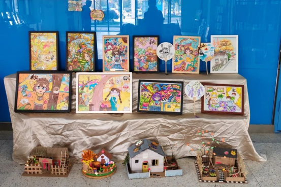 手工展区:孩子们用纸板、树枝、落叶、黏土、彩纸等材料创作立体作品,《秋日画卷》《农家小院》《又是秋来》等作品充满巧思,与绘画作品相映成趣,让艺术氛围更显浓郁。每一处细节都凝聚心血,让校园变身沉浸式艺术画廊。