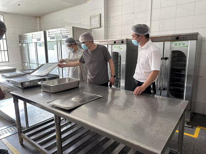 第一检查组重点检查了学校食堂、学生宿舍、校园东侧待拆迁地块及围墙等区域。在食堂区域,检查组深入食品加工间、原料仓库和餐具消毒间等关键场所,仔细查验食材新鲜度与储存条件,重点关注冷藏冷冻设备运行状态、食品留样及卫生清洁情况。