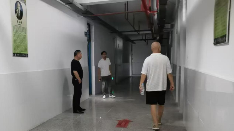 第二检查组先后对教学楼、地下车库、实验室、校园西侧原家属区及围墙等区域进行了全面排查。检查组逐层检查教室门窗、多媒体设备用电安全,认真核查走廊通道和楼梯间疏散指示标识是否清晰、应急照明是否正常,并对各楼层消防栓、灭火器等消防设施的完好性和可用性进行现场测试。
