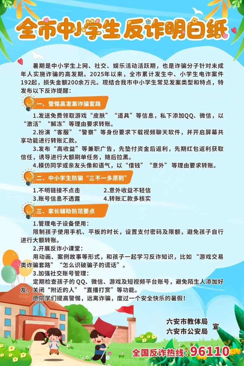 暑期是学生群体电诈案件高发期,为加强宣传,遏制发案势头,提升学生及家长群体诈骗防范意识和识别能力,市教体局、市公安局联合制作了《全市中小学生反诈明白纸》,请大家积极宣传推广,共同守护好全市学生家庭的“钱袋子”。