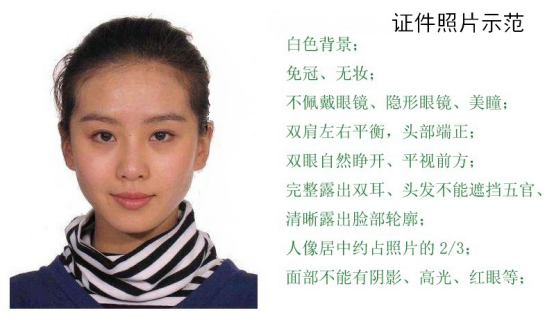 1.不能佩戴眼镜、隐形眼镜、美瞳,面部不能有阴影、高光、红眼等,头发不能遮挡五官,人像边缘不能有锯齿,不能使用美颜软件修图美化,不能翻拍过往照片,不能裸露上身,必须如实反映本人近期相貌。