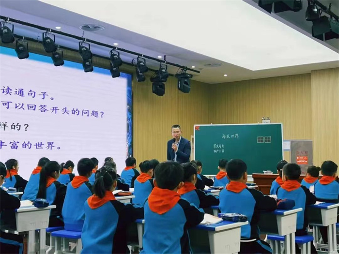 第三节课是淮安市五里九年制学校吴刚老师的《海底世界》。吴老师围绕“景色奇异”“物产丰富”进行读写教学,由朗读、默读、品读,拾级而上,举一反三,从方法到实践,引领学生落实重点,突破难点,课堂语言朴素又精致,富有张力。