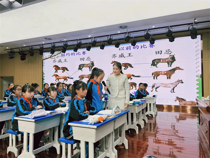 第七节课是六安市佛子岭小学王金梅老师执教的《田忌赛马》。王老师设计“了解故事梗概、探寻思维密码、拓展思维阅读”三个任务,聚焦赛前对话,启发学生思辨思维,让学生在思考和表达中走向深刻理解。