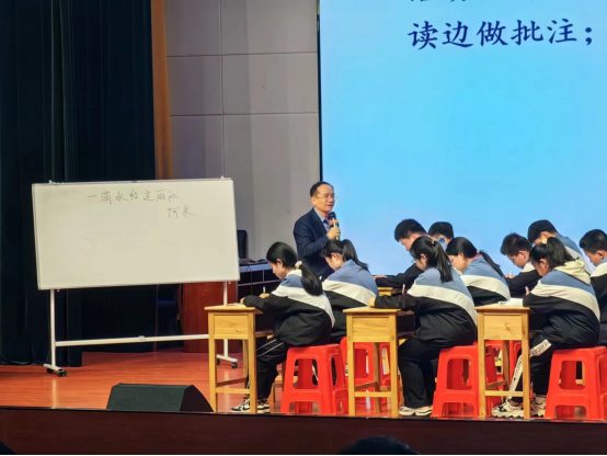 裕安区教体局教研室中学语文教研员、安徽省第三届高中语文教坛新星、安徽省第四届初中语文教坛新星获得者刘晓武老师带来示范课《一滴水经过丽江》。学生在刘晓武老师的循循善诱下,展开以“读-品-悟”三环节的学习历程。通过各种形式的朗读,学生逐步感受到丽江的美。整节课充分发挥了学生的主体地位,点燃了学生的思维之花。