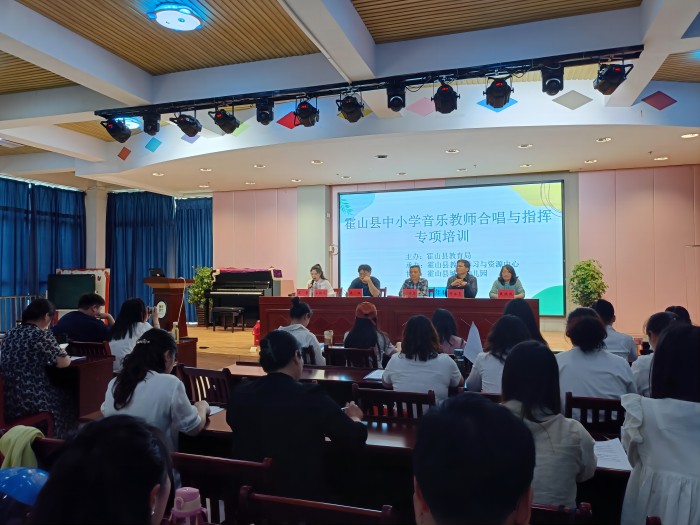 以训促教,专业素质全面增强。为进一步提升全县中小学音乐教师合唱指挥水平,发挥合唱教学的综合育人功能,4月26日,霍山县教育局举办了全县中小学音乐教师合唱指挥培训班,90名中小学音乐教师参加此次培训。培训班上,皖西学院的邓启亮教授为大家做了《合唱指挥基本知识》的专题讲座,从合唱的指挥技法、指挥手势语言综合运用、合唱声音处理、作品情感的处理等方面,详细介绍了合唱指挥的技巧和原则,介绍了不同节拍的基本图示和常见的挥拍方法与使用意境。讲座还通过对《半个月亮爬上来》、《送别》、《保卫黄河》等合唱作品的深度剖析和现场的纠正指导,耐心解答了老师们在实践训练中的困惑,让参训教师对合唱指挥又有了全新的领悟,开阔了教师们对合唱教学的新视野,树立了合唱教学的新理念。