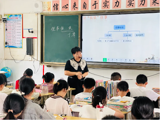 第一节课由登科学校鲍云云老师执教,执教的课题是七年级上册著名语文教育家于漪老师的《往事依依》。这节课以任务情境为切入点,教学围绕主线任务“仿写一首诗歌”展开,依次安排了“话依依往事”“解依依之情”“悟依依之理”“抒依依追求”四个支线任务。课堂上,朗读教学方法贯穿始终,抓住学生个别读、齐读、朗读评价等层层突破重难点,激发学生对诗歌仿写的兴趣,领悟依依往事对于漪老师的深刻影响,培养学生对自然、读书和祖国的热爱。