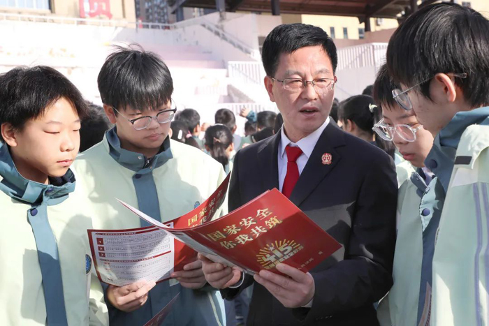 六安九中开展全民国家安全教育日主题教育活动。活动上,裕安区法院三级高级法官、六安九中法治副校长程平为师生带来题为《守护国家安全 共建和谐校园》的专题授课。程平结合《国家安全法》《未成年人保护法》等法律法规,深入剖析国家安全涵盖的16个领域,指出“国家安全是民族复兴的根基,校园安全是青春成长的土壤”。他通过真实案例,警示学生警惕网络泄密、校园欺凌、网络诈骗等安全隐患,呼吁全体学生做国家安全的守护者、法治校园的践行者。活动现场,裕安区法院工作人员发放《国家安全知识手册》等资料,学生们热情高涨,极大地激发了同学们对国家安全知识的兴趣。学生代表带领全体学生庄严宣誓,用坚定有力的声音,许下为维护国家安全贡献力量的承诺,展现出“志笃少年”的担当与决心。