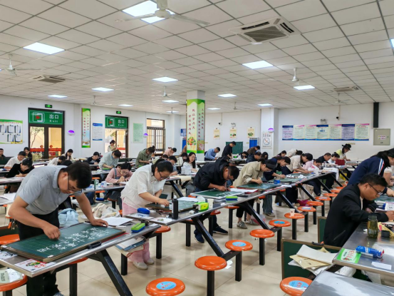 赛场上,教师们全神贯注。软笔书法时笔走龙蛇,作品苍劲飘逸;硬笔书法运笔流畅,尽显汉字结构与线条之美;粉笔字书写精心布局,板书工整美观;简笔画创意十足,生动场景跃然纸上。教师们以热情与严谨的态度,用精湛技艺诠释对教育事业的热爱。