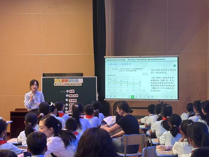 活动第二环节由华东师范大学附属六安学校刘梁宇老师对北师大版数学五年级下册第8单元《复式折线统计图》第2课时“试一试”进行说课与课例展示。整节课将数学技能训练、数据分析能力培养与国家安全教育、生态环保责任意识培育有机结合。