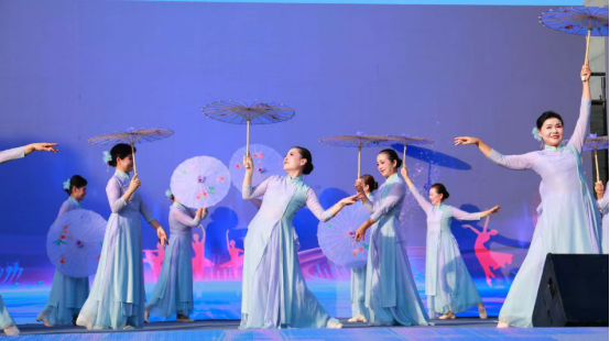 活动现场,《细雨染皋城》从舞蹈动作的细节打磨,到队形的巧妙编排,一群舞者用她们的舞姿勾勒出一幅古韵悠悠的皋城细雨图。