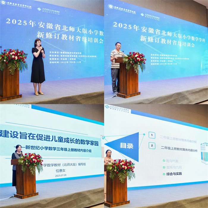 培训会上,安徽省教科院院长王勇、北师大出版集团安徽区域负责人、省小学数学教研员杨怡等专家出席开幕式并致辞。北师大版小学数学教材分册主编何凤波、位惠女、田红霞等专家对二、三年级教材的各领域进行了深入解读,为参训教师提供了专业的理论指导。