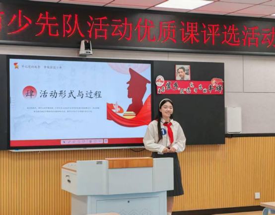 本次比赛分为说课与上课两个环节,在上课环节中聚焦“纪念抗日战争胜利80周年”核心目标,在课程设计中打破传统宣讲模式,融入情景演绎、实物研学等多元形式。让“家国大义”从文字转化为可感知的情感体验,将抗战重要战役、英雄人物事迹等知识点融入活动任务,队员们在协作闯关过程中完成历史知识的学习与内化。此外,“从数字密码到强国密码”“一根绳,拧出抗战团结劲”等内容,也通过沉浸式、体验式教学,让少先队员在实践中理解抗战精神的时代内涵。