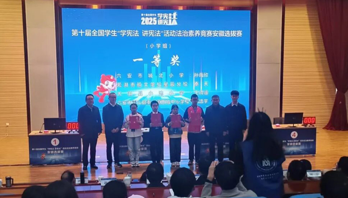 10月26日,第十届全国学生“学宪法 讲宪法”活动法治素养竞赛安徽选拔赛落下帷幕,六安市城北小学六(4)班孙雨欣同学荣获小学组第一名,将与初中组、高中组、高校组的省赛第一名选手组成安徽代表队,共同征战全国总决赛。