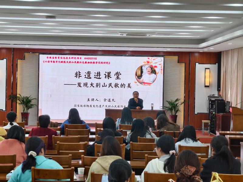 下午的专题讲座,国家级大别山民歌传承人余述凡以《非遗进课堂——发现大别山民歌的美》为题,将原生态演唱与曲调解析深度融合,让老师们亲身感受到了本土音乐的文化密码,为民歌教学从“教唱”到“传神”提供了切实可行的路径。六安市教研员朱凌则以《感受美、鉴赏美、表达美和创造美》为题,将音乐的理论高度与教学实践紧密结合。她引导教师从教育家精神的视角重新审视日常课堂,激发了与会教师对美育使命的深层思考,实现了从教学技术到教育哲学的升华。