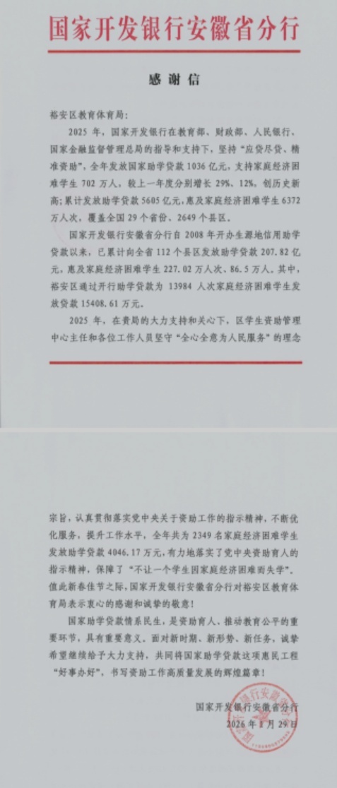 值此新春佳节来临之际,裕安区教体局收到国家开发银行安徽省分行发来的感谢信,信中对裕安区2025年生源地信用助学贷款工作的精准落实、高效服务与显著成效给予高度评价,向长期奋战在助学一线的工作人员致以衷心的感谢和诚挚的敬意。