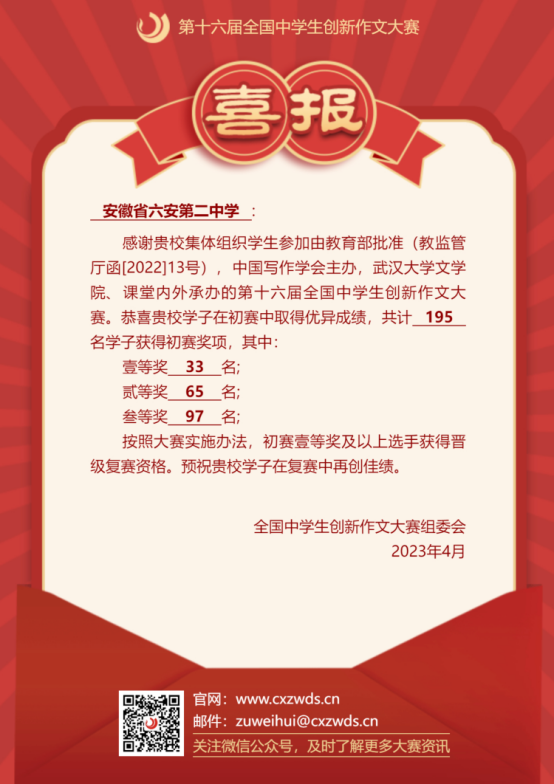 第十六届全国中学生创新作文大赛安徽赛区初赛成绩发布,六安二中学子在本次大赛中取得优异成绩,高一高二年级共有195名学子获奖,其中一等奖33名,二等奖65名,三等奖97名。