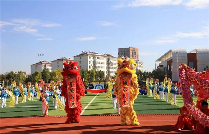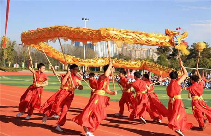 瑞狮欢舞歌盛世,龙腾狮舞送吉祥。非遗文化舞龙舞狮是本次文艺演出的压台节目,学生们挥动着色彩艳丽的金龙上下翻腾、蜿蜒起舞;威武而不失可爱的醒狮踢跳翻蹬、立卧滚抖,一时间操场上龙腾狮舞,热闹非凡。