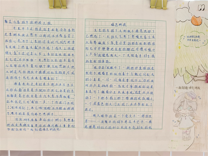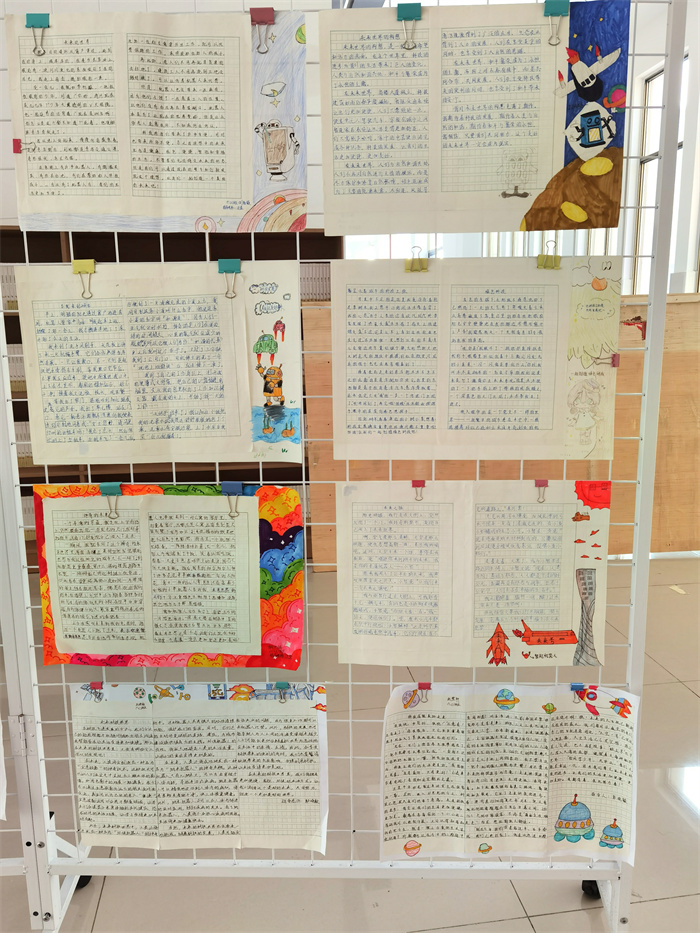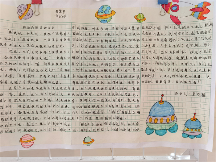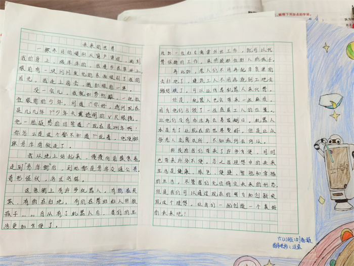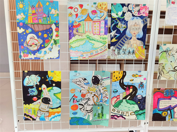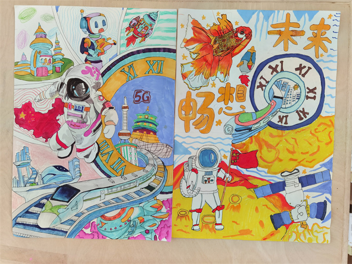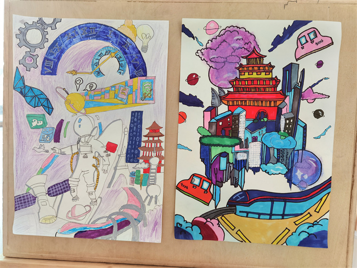 同学们通过对未来科学发展的畅想和展望,用自己手中的笔描绘着有关未来世界的奇思妙想,迸发出绚丽多彩的火花。