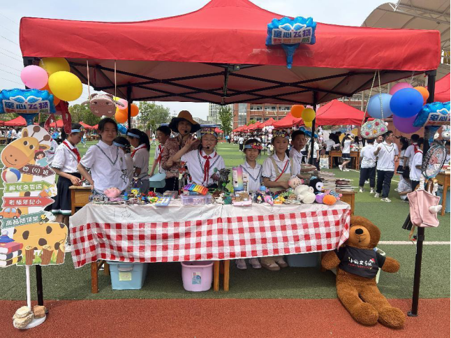 “摊”开爱心,“艺”“童”售卖。各班义卖的摊位在操场上依次摆开,展台设计新颖、美观。“售货员”“推销员”“收银员”“经理”“环保员”“店长”,佩戴胸卡、绶带或围裙等,各司其职,每班都准备一个“爱心箱”或“收银箱”用作收款。以美的名义,与爱约定,秉承着奉献的初心。爱心义买方为全体师生,佛子岭路小学党支部书记、校长张琼宣布活动开始。大家奔走于各个摊位之间,到各店铺选购心仪物品,把爱心化为义卖的动力。孩子们卖力吆喝,想出各种办法促销商品,“店家们”使出浑身解数来吸引顾客,叫卖声此起彼伏,讨价还价,热闹非凡。各个小摊前人头攒动,欢声笑语,操场成为了欢乐的大卖场,每一笔成功的买卖,都代表着一份爱心的传递,同学们也体会到了分享和付出的快乐。一张张精心设计的条幅,一句句别有新意的标语,一列列琳琅满目的商品,把市场的氛围装点得分外浓厚。生命因为有了爱而更为富有,生命也因为付出爱而更有价值!孩子们以满腔热忱和实际行动传递着爱与温暖。