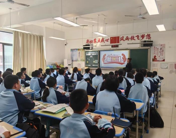 来自九亭第二中学道德与法治教研组的孙晨佳老师在七(3)班进行了《自由平等的真谛》的展示课,道德与法治组老师参与听课。孙老师采用议题式教学,学生以小组合作形式参与课堂讨论。整个教学过程始终贯彻基于问题解决为主要特征的学习活动设计,围绕五一假期旅游见闻创设情境,设置系列问题链 作为分析框架,循序渐进,增强情境的思辨性。同时,通过对真实问题的探究与分享,引导学生关注社会,注重学习内容的生成和应用,通过知识问题化、问题情境化、情境活动化,层层深入,促进学生对问题情境分析能力与对不同维度信息进行综合能力的提升,凸显核心素养的培育。