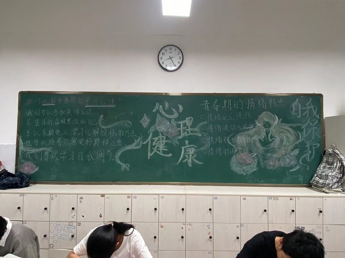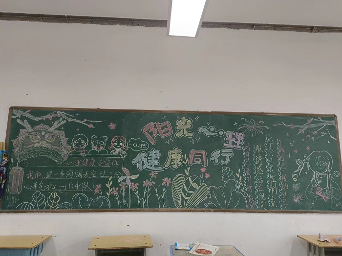 各班师生广泛收集素材,绘制的黑板报主题突出,内容丰富。有心理健康的小测试,有调节心理健康的小知识,有关于“心理健康节”的介绍,还有悦纳自己的小妙招,还有心灵小窗口,供同学们贴心灵寄语。板报设计丰富多彩,不仅展示了师生的才华,也向同学们宣传了心理健康的相关知识。