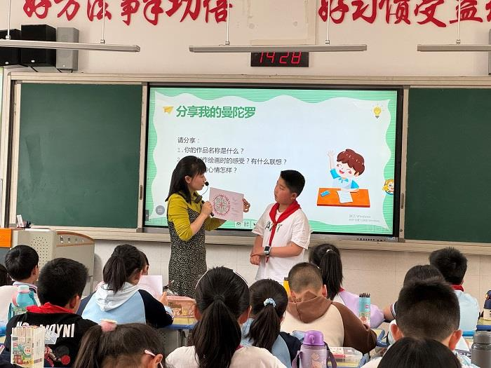 在课堂中,杨开萍老师用巧妙的环节设计衔接课程内容,围绕主题中心思想“减压”和归因种类,通过设计、展示、讨论绘画等方式让学生根据自己日常生活经验用画笔画出曼陀罗花朵,将课堂还给学生,教师作为引导者,相信学生有自己的收获和感悟。在杨开萍老师的引导下,学生们积极发言,开动大脑,利用画笔画出了多姿多彩的图画,生成性的课堂是最有活力的。