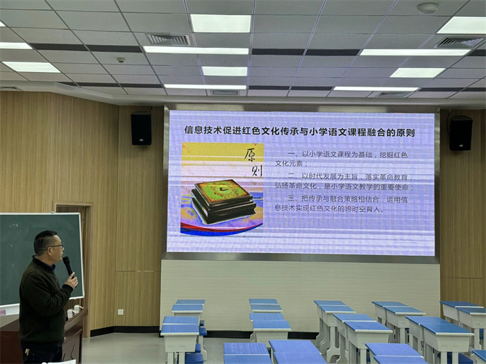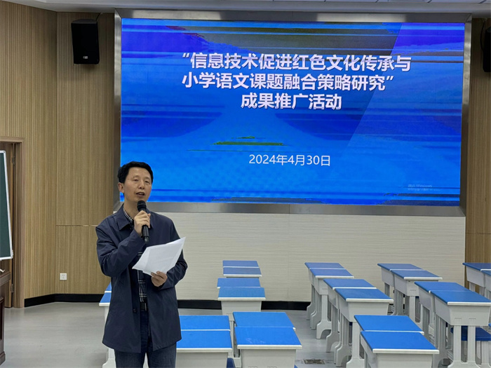 活动第三项是课题主持人赵光辉做课题汇报。经过两年的课题研究,在课题组全体成员的努力下,呈现可喜的“三个提高”:一是该校教师理论水平和实践能力不断提高,凝练出12篇课题研究成果。5篇论文在全国中文核心期刊《小学教学研究》《小学教学参考》发表,多人次获市、区级教育教学论文评比一二等奖,集结出版了《信息化教育教学设计集》《信息化教育教学案例集》《教育教学资源库》《现状与问题调查报告》;二是教师的教学素养有了不同程度提高,语文课受到学生们的欢迎与好评。2022年课题组成员有3人被评为金安区教坛新星,1人被评为市级骨干教师,1人获六安市2022年班主任基本功大赛获二等奖,其中王玉珠、胡传柳两位教师在六安市小学语文优质课比赛中均获一等奖第一名,并在全市作教学展示。在微课、德育精品课教育教学论文评比中,多人次获省、市、区级奖;三是学生的语文综合素养得到极大提高。学校积极推进红色经典读书工程,通过开展读红色经典、走进红色基地、红色经典课本剧展演等系列语文活动,让学生了解了更多的红色文化知识和英雄故事,实现从“小我”到“大我”的转变,增强了爱国情怀和社会责任感。
