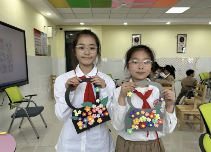 课堂上,听说要制作礼物给妈妈,同学们都异常兴奋。在老师的指导下,他们认真地一步一步完成自己的作品,一边制作一边和同伴交流,都想要把最好的作品献给妈妈。“我想在这里再加一些装饰,这个礼物一定很特别。”“快看我的作品,我做出来啦!”“我的妈妈一定会很喜欢这个礼物!”大家互相展示自己的作品,教室里氛围活跃而又温馨。