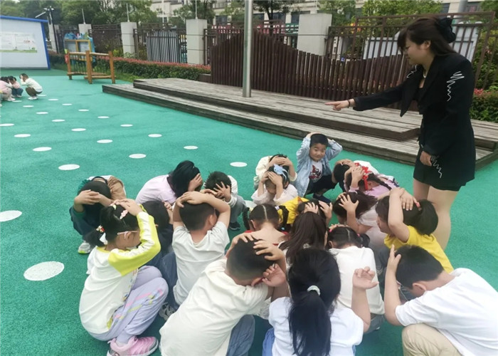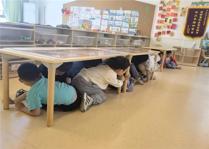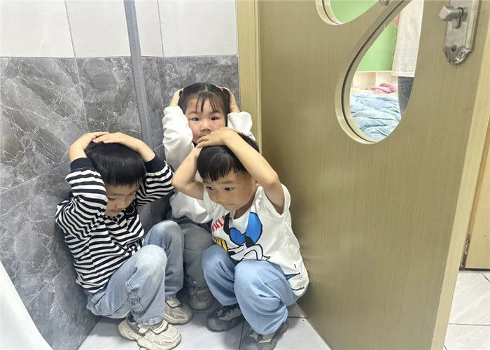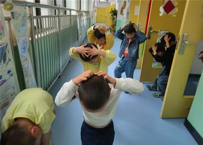 演练前,教师以班级为单位,组织幼儿开展防震减灾知识宣讲,普及安全教育知识,帮助幼儿熟悉应急避震的方法。 随着第一声警报响起,防震应急演练正式开始,老师立即组织幼儿停止活动,指挥幼儿以最快速度就近躲到墙角、桌下、支撑结构较多的空间,进行紧急避险。 当第二声警报响起,各班老师立即组织孩子们双手护头、降低重心,快速有序地撤离到户外场地。 幼儿疏散到达安全地点后,老师立刻清点幼儿人数,确保所有幼儿安全撤离,安抚幼儿的情绪,并向总指挥汇报班级疏散情况。
