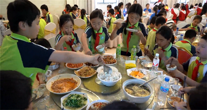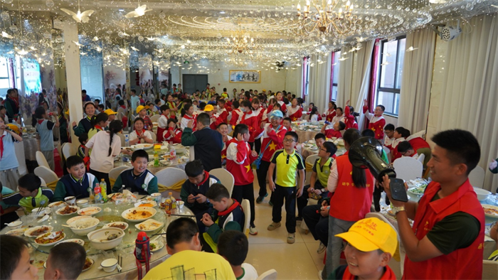 午餐时,孩子们分桌而坐,“自己动手,丰衣足食”,尽情品尝着简单俗常的饭菜,觉得格外香甜,碗盘干净,一扫而光。午餐间,在教官的带领下,孩子们摇头晃脑,跳起了欢快的舞蹈,自娱自嗨,把整个午餐的气氛拉得满满。