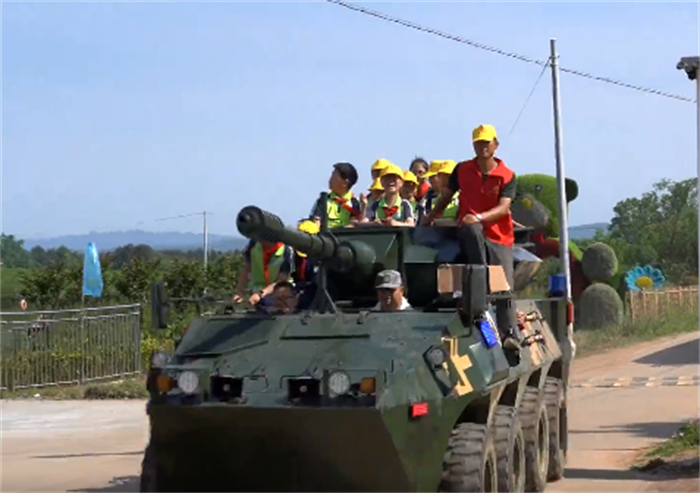 最让孩子们感兴趣的是,跟着教官坐上了装甲战车,威风凛凛地绕基地一周,“巡视军情”。个个心花怒放,神气十足。立在装甲车上,孩子们一边体验着装甲战车的高大威猛,一边聆听着教官的介绍,了解了许多现代化国防武器的名称和神威,心里涌动着对祖国的无比热爱、对祖国国防建设成就的自豪。