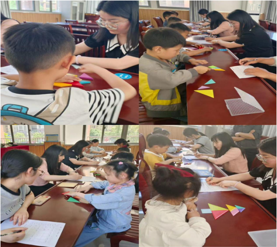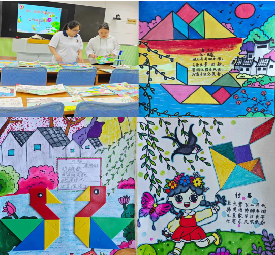 七巧板创意画。七巧板是一种传统的智力玩具,古诗词是我国传统文化中的瑰宝,当七巧板遇上古诗词,会碰撞出怎样的火花呢?看!有将七巧板拼成诗句中的画面,如山水、船只、动物等,以此来展示诗句所描绘的美好景象,有将古诗词与七巧板的拼图过程相结合,将诗句中的文字或意象融入七巧板的造型设计中。此次活动不仅引导了孩子们在玩的过程中感受古诗词的魅力,培养他们对传统文化的兴趣,同时,让多学科知识互相融合,更是践行新课标学科融合要求的体现。