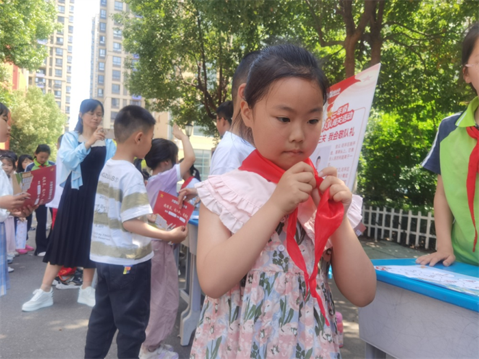 “我会系红领巾”处,一群老队员正在教小朋友们佩戴红领巾。教学的老队员一丝不苟,学习的新队员用心用情。折叠、围脖、打结,整尖,人人顺利过关,个个激动得欢呼雀跃。